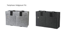 Sie können wählen, ob Sie unser Standardsortiment oder diese Tasche innerhalb von wenigen Wochen individualisieren wollen. Filz-/Gurt-Farbe und den Aufbau können für Sie maßgeschneidert anpassen.